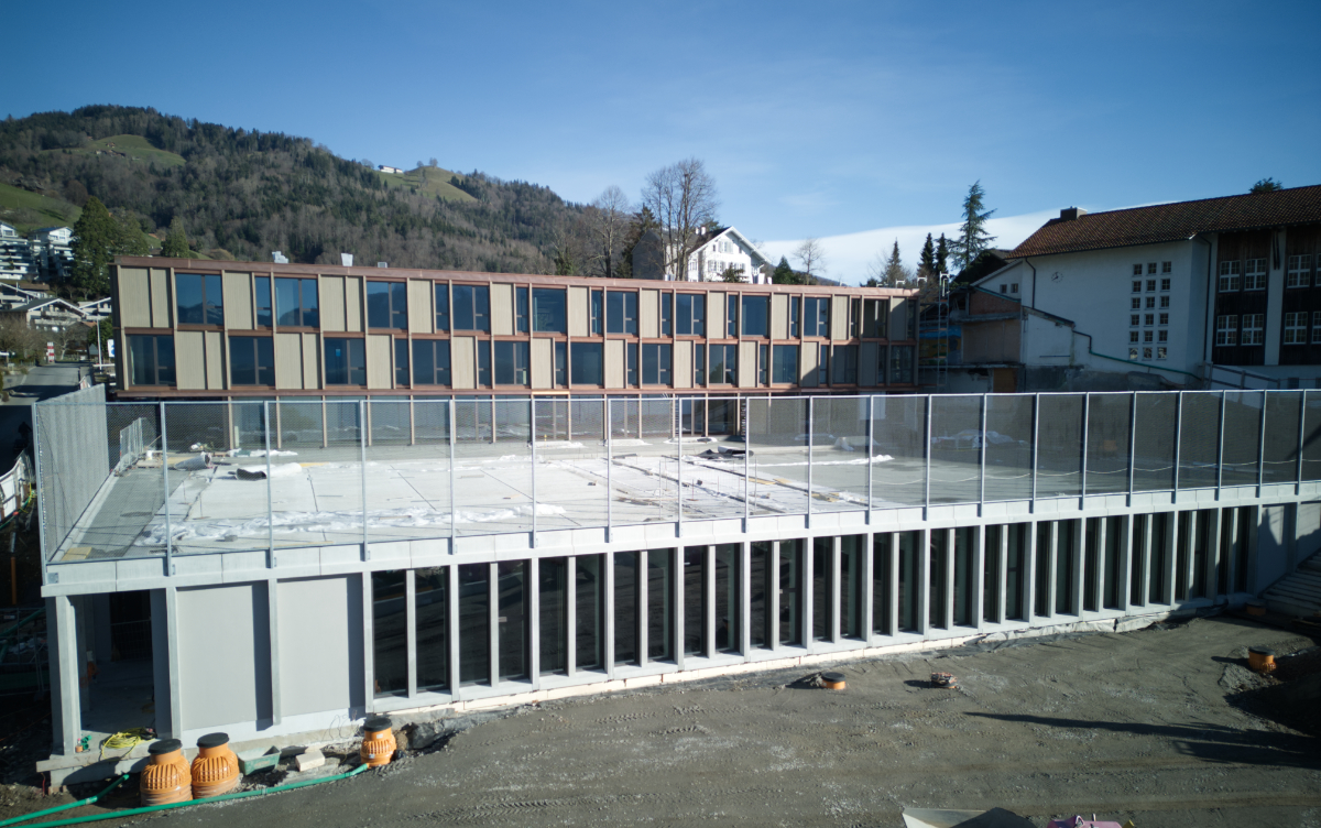 Das neue Friedbühl-Schulhaus mit der Turnhalle während der Bauphase im Frühling 2024.